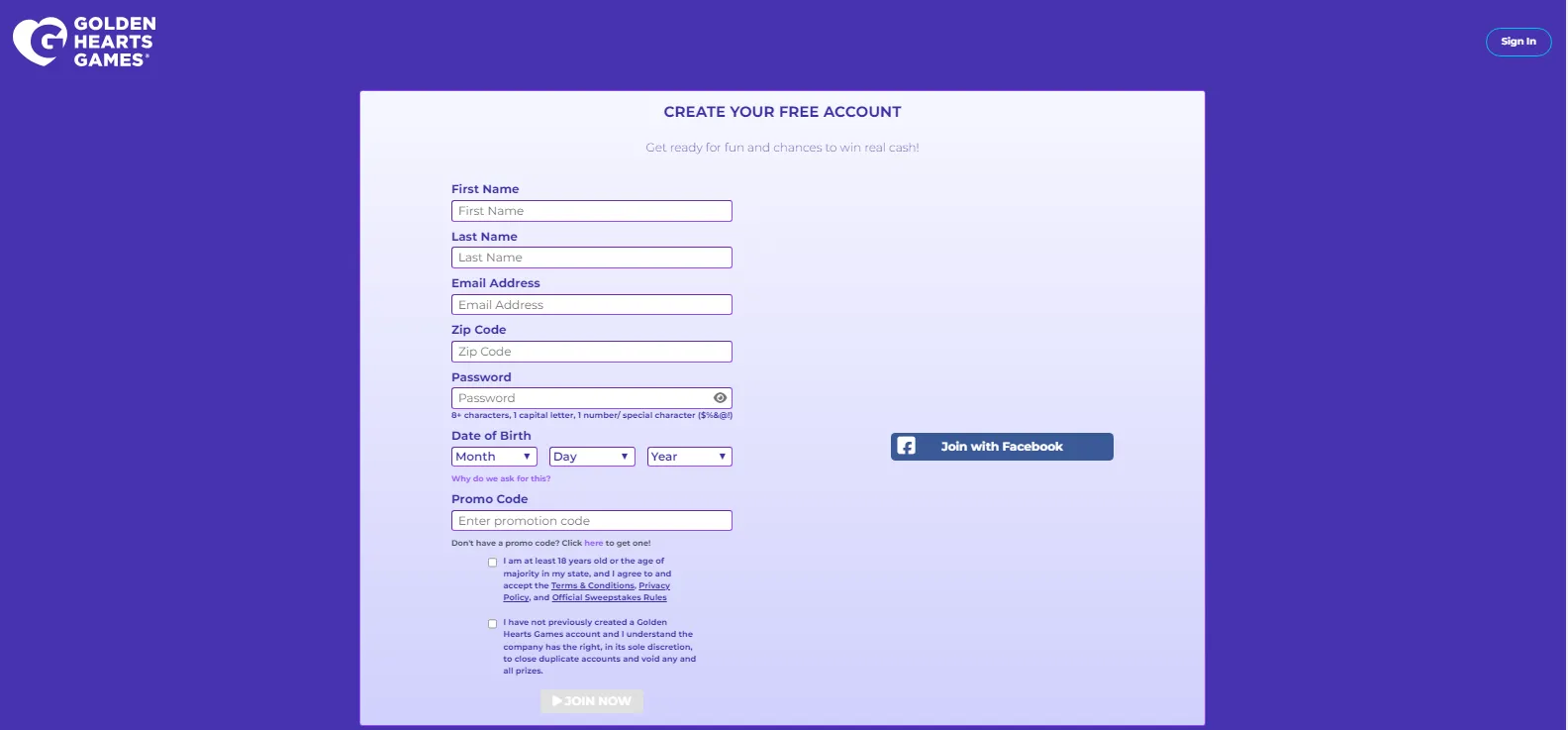 Explore Golden Hearts Gamesāa unique casino blending gaming with charity. Enjoy slots, bingo, and more while supporting good causes. Play responsibly. 4.5 Registering at Golden Hearts Games is straightforward and designed to ensure both security and ease of use. To get started, simply provide your name, email address, residence zip code, date of birth, and, optionally, a promo code. You also have the option to use your Facebook account for even quicker setup. Once you enter your basic details, the website prompts you to agree to the Terms and Conditions, Official Sweepstakes Rules, and Privacy Policy, which is essential for proceeding.