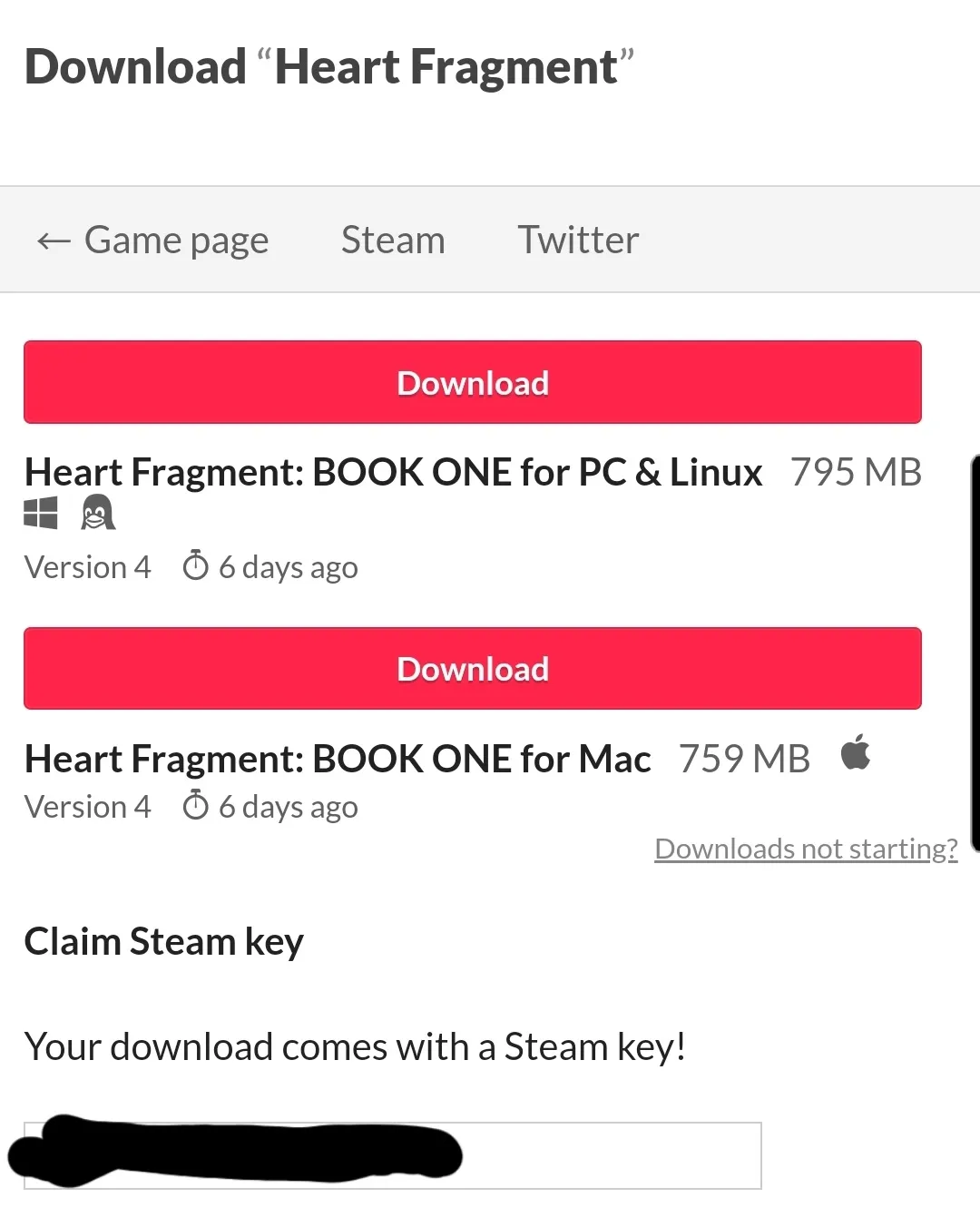 ReplyHeart Fragment2 years agoHello! Thanks for purchasing Heart Fragment! The steam key should be listed underneath the downloads, with an option that says “reveal Steam Key”. It will look similar to this.