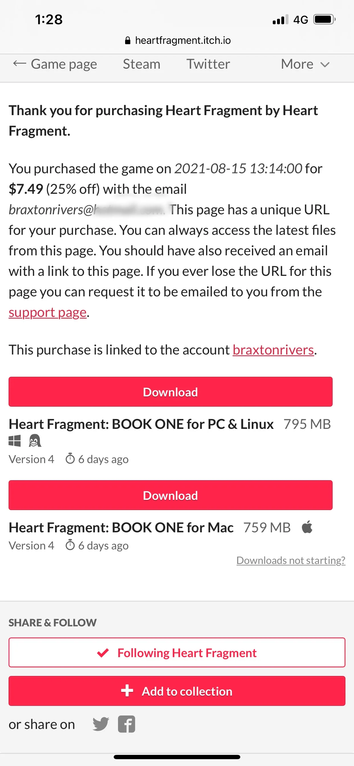 ReplyHeart Fragment2 years ago(+2)Hello! Thank you so much, this is so kind of you! The itch purchases of Heart Fragment don’t come with Steam keys anymore, but you can support the game through Ko-fi if you’d like. Otherwise, waiting to purchase the DLC works as well. I appreciate that support a lot!!!