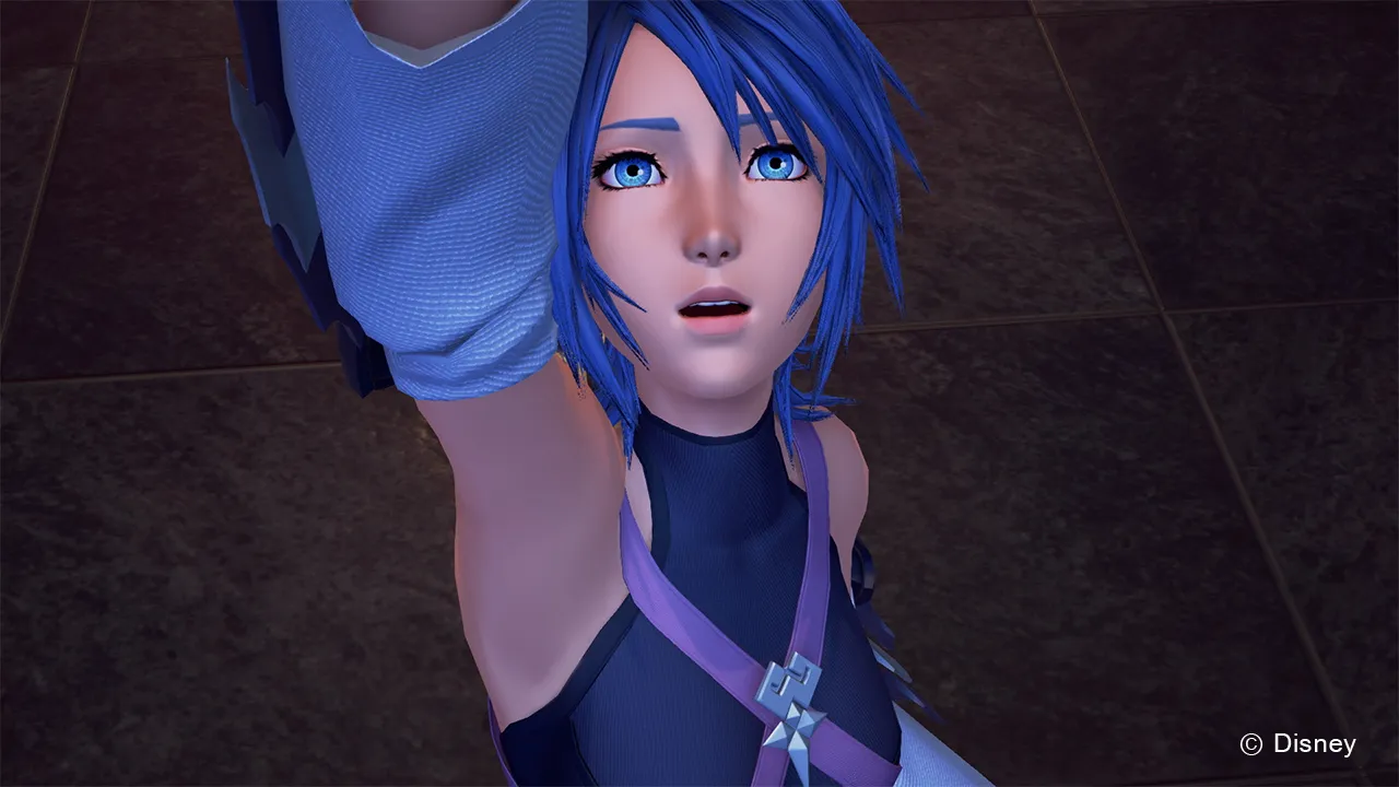 After sacrificing herself to save Terra from the Realm of Darkness at the end of Birth by Sleep, Aqua has been wandering in darkness for 10 years, trying to find a way back to the Realm of Light. She visits the dark versions of Castle of Dreams, Dwarf Woodlands, and Enchanted Dominion to battle hordes of Heartless that form into Demon Towers, fight apparitions of Ventus and Terra, and save Terra’s heart. Meanwhile, Mickey went to the Realm of Darkness to save Riku. When he meets Aqua after using her lost Wayfinder to find her, he tells her 10 years have passed since they last met and proceeds to Destiny Islands after fighting another Demon Tower. There, the door to Kingdom Hearts is spotted, and Mickey helps Sora and Riku seal it shut, leaving Aqua to dwell in the Realm of Darkness once more.
